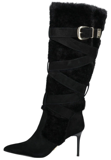 Dieser auffällige Damenstiefel vereint extravagantes Design mit femininer Eleganz. Der hohe Schaft ist mit weichem Fellbesatz und dekorativen Riemendetails versehen, die dem Stiefel eine luxuriöse Optik verleihen. Ein schmaler Absatz sorgt für eine elegante Silhouette und streckt das Bein. Dank des seitlichen Reißverschlusses lässt sich der Stiefel bequem an- und ausziehen. Perfekt für modebewusste Auftritte an kalten Tagen oder besondere Anlässe – ein echtes Highlight in jedem Outfit.