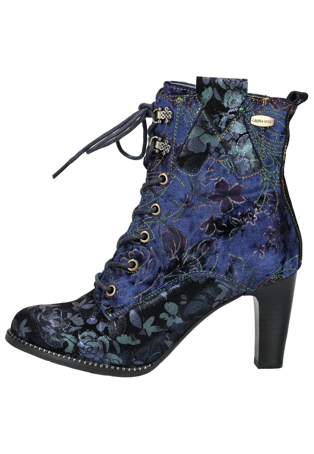 Mit dieser modischen Stiefelette von Laura Vita wird die Trägerin unweigerlich zum Blickfang. Dieses elegante Modell macht selbst das einfachste Outfit zu einem Highlight. Das Obermaterial aus Veloursleder wird durch Blumenapplikationen und bunte Nähte zusätzlich betont. Der seitliche Reißverschluss ermöglicht ein müheloses Anziehen, während der Riemen am Schaft für optische Raffinesse sorgt und die Schnürung gleichzeitig für optimalen Halt.