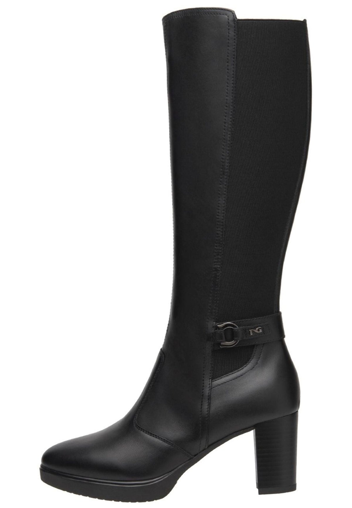 Eleganter Langschaftstiefel mit komfortablem Blockabsatz und dekorativer Schnalle. Das elastische Stretchmaterial sorgt für optimale Passform am Bein.