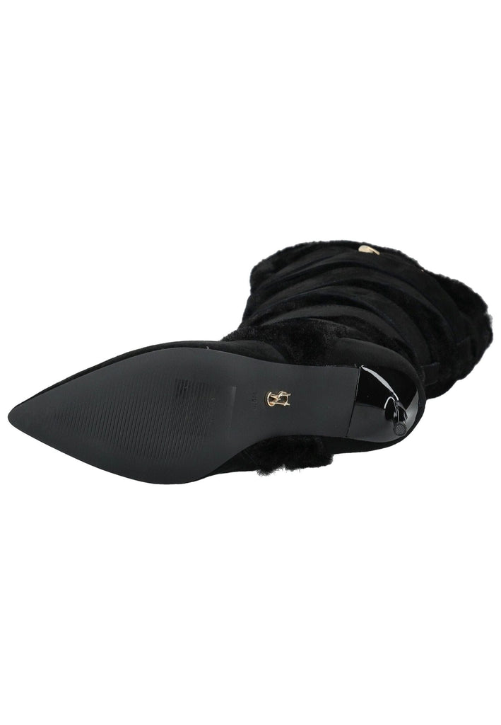 Dieser auffällige Damenstiefel vereint extravagantes Design mit femininer Eleganz. Der hohe Schaft ist mit weichem Fellbesatz und dekorativen Riemendetails versehen, die dem Stiefel eine luxuriöse Optik verleihen. Ein schmaler Absatz sorgt für eine elegante Silhouette und streckt das Bein. Dank des seitlichen Reißverschlusses lässt sich der Stiefel bequem an- und ausziehen. Perfekt für modebewusste Auftritte an kalten Tagen oder besondere Anlässe – ein echtes Highlight in jedem Outfit.