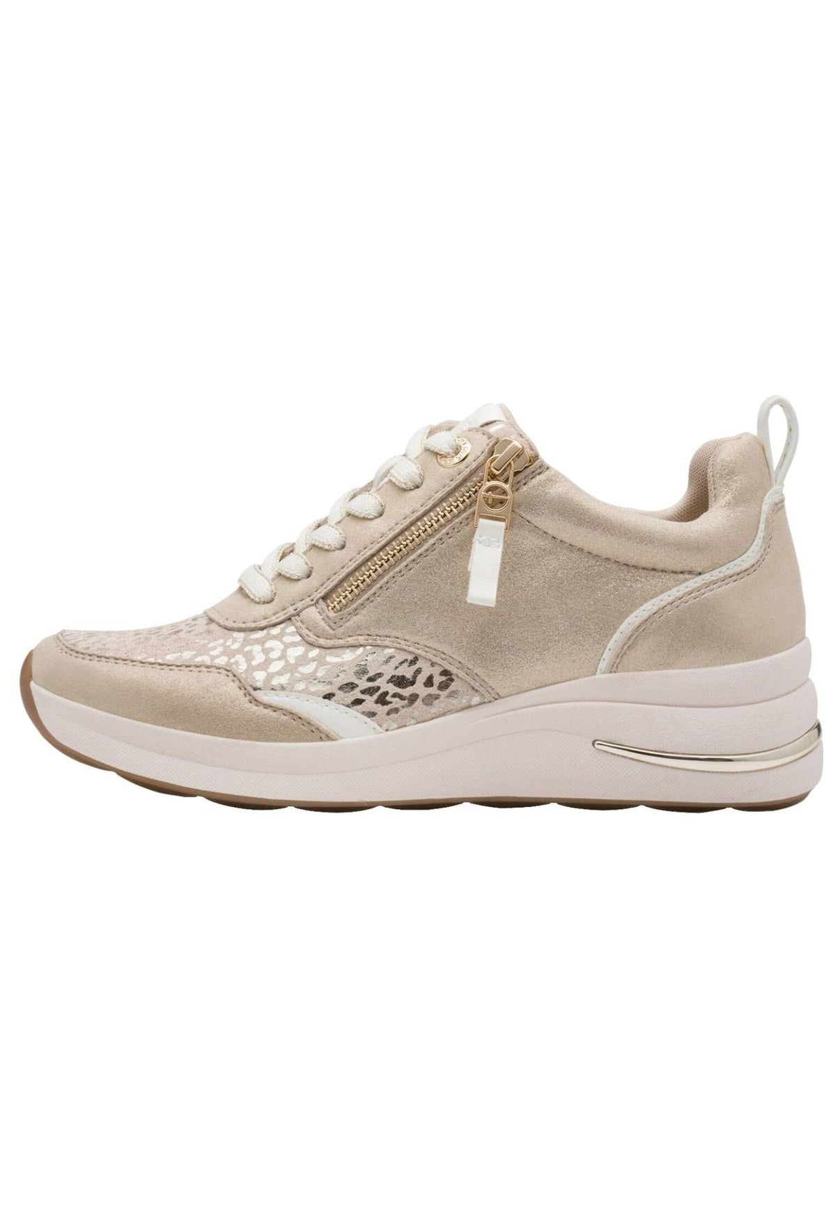 Dieser modische Sneaker vereint elegantes Design mit hohem Tragekomfort und ist der ideale Begleiter für den Alltag. Das Obermaterial kombiniert hochwertige Materialien in harmonischen Beige- und Goldtönen und wird durch dezente Musterdetails stilvoll ergänzt. Die klassische Schnürung sorgt für eine optimale Passform, während der seitliche Reißverschluss ein schnelles und bequemes An- und Ausziehen ermöglicht. Für zusätzlichen Komfort ist der Schuh mit einem herausnehmbaren Wechselfußbett ausgestattet und eignet sich daher auch ideal für eigene Einlagen. Die weich gepolsterte Innenseite unterstützt ein angenehmes Tragegefühl, während die leichte, dämpfende Laufsohle für Stabilität und Komfort bei jedem Schritt sorgt. Dank seines modernen und zugleich eleganten Looks lässt sich dieser Sneaker vielseitig kombinieren und passt perfekt zu sportlich-eleganten sowie lässigen Freizeit-Outfits.