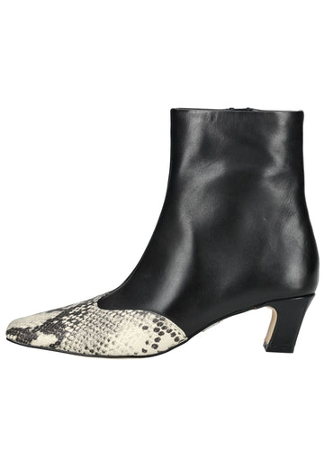 Diese elegante Stiefelette kombiniert klassische Formen mit trendigen Akzenten. Das glatte Obermaterial wird durch die markanten Schlangenprint-Details an der Spitze und am Absatzbereich stilvoll ergänzt. Der bequeme Blockabsatz sorgt für sicheren Halt und hohen Tragekomfort, während der seitliche Reißverschluss ein einfaches An- und Ausziehen ermöglicht. Ein modischer Begleiter, der sowohl im Alltag als auch zu besonderen Anlässen jedes Outfit aufwertet.