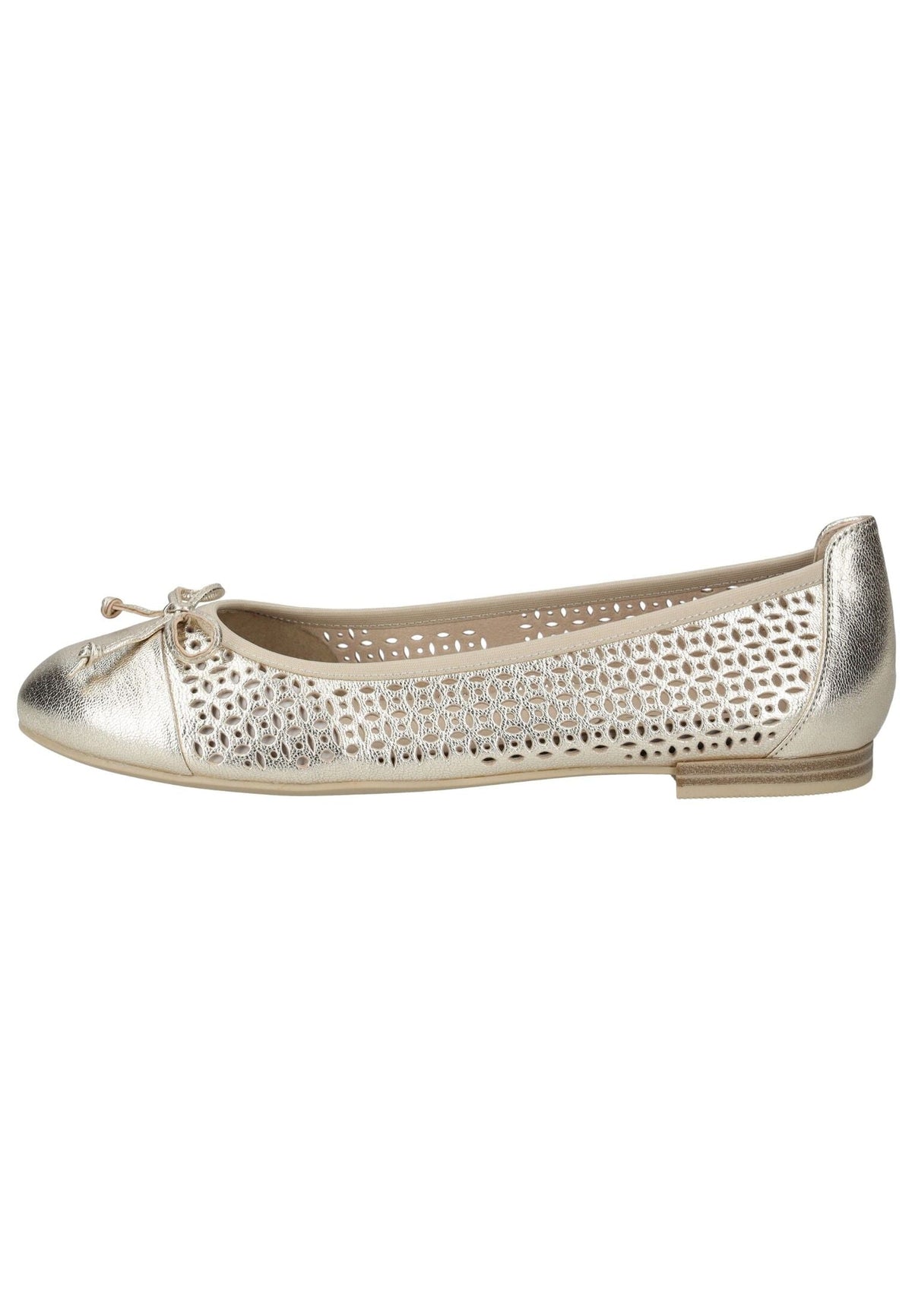 Ein wunderschöner Ballerina aus dem Hause Caprice. Das Modell ist aus atmungsaktivem und anschmiegsamem Leder in Metallic-Optik gefertigt und mit einer dekorativen Schleife am Vorderblatt versehen. Ein absoluter Blickfang, sind die Ausstanzungen an diesem Schuh. Für ein angenehmes Fußklima sorgt die feuchtigkeitsregulierende Lederdecksohle, die bei Bedarf gewechselt werden kann.