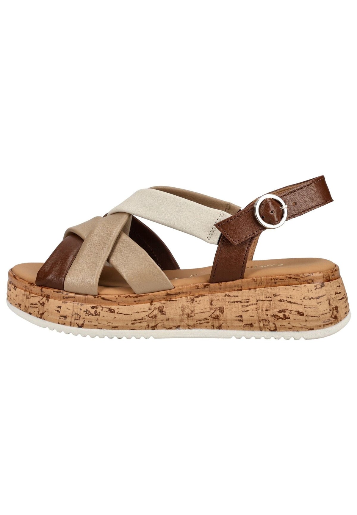 Diese Sandale setzt mit ihrem ausdrucksstarken Design modische Akzente und sorgt zugleich für hohen Tragekomfort. Die überkreuzten, weich gepolsterten Riemen schmiegen sich angenehm an den Fuß an und bieten zusammen mit dem verstellbaren Fersenriemen sicheren Halt. Das komfortable Fußbett unterstützt ein entspanntes Laufgefühl, während die leichte Plateausohle in Korkoptik für eine trendige Note und zusätzliche Dämpfung sorgt. Ein stilvoller Begleiter für warme Tage, der jedes Outfit mit einer frischen, modernen Ausstrahlung ergänzt.