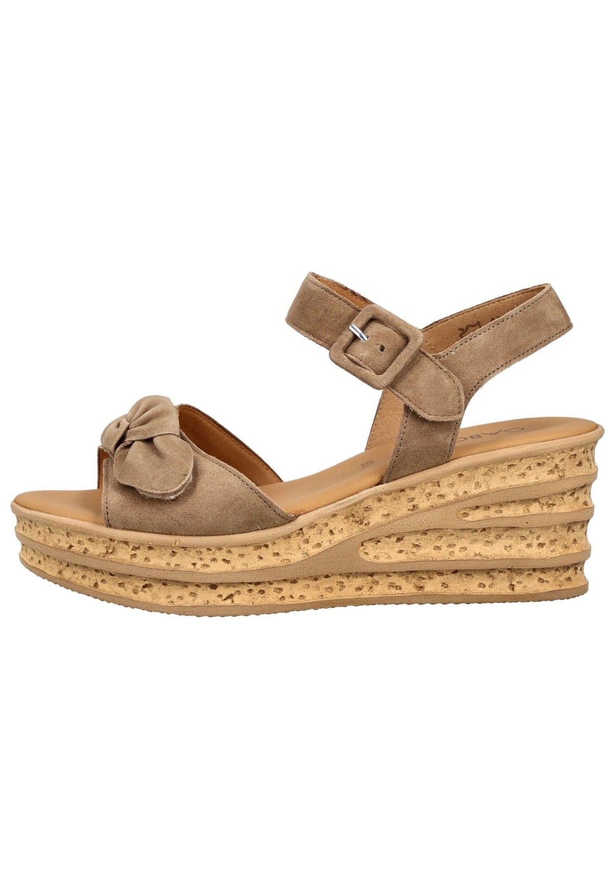 Diese feminine Sandale von Gabor verbindet modisches Design mit hohem Tragekomfort und ist der perfekte Begleiter für stilvolle Sommerlooks. Das weiche Veloursleder verleiht dem Modell eine edle, natürliche Ausstrahlung, während die dekorative Schleife auf dem Vorfuß für einen charmanten, verspielten Akzent sorgt. Der verstellbare Fersenriemen mit Schnalle ermöglicht eine individuelle Anpassung und sorgt für sicheren Halt. Die weich gepolsterte Innensohle bietet ein angenehmes Laufgefühl, auch an langen Tagen. Besonders ins Auge fällt die markante Keilsohle in strukturierter Optik, die dem Schuh eine moderne Note verleiht und gleichzeitig für eine bequeme Absatzhöhe sorgt. Ob zu luftigen Kleidern, Röcken oder sommerlichen Hosen – diese Sandale rundet jedes Outfit stilvoll und komfortabel ab.