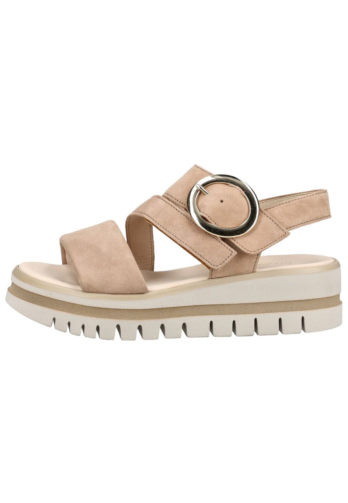 Diese moderne Sandale von Gabor verbindet trendstarkes Design mit hohem Tragekomfort. Das hochwertige Obermaterial in edler Veloursoptik verleiht dem Modell eine stilvolle Ausstrahlung, während der breite Riemen mit markanter, runder Schließe einen modischen Akzent setzt. Der weich gepolsterte Innensohlenbereich sorgt für ein angenehmes Laufgefühl – ideal für lange Sommertage. Die leichte Plateausohle mit dezentem Metallic-Streifen unterstreicht den modernen Look und bietet gleichzeitig eine komfortable Höhe. Dank der flexiblen Laufsohle genießen Sie sicheren Halt und ein bequemes Abrollen bei jedem Schritt. Eine vielseitige Sandale, die sich perfekt zu luftigen Kleidern, lässigen Jeans oder eleganten Sommer-Outfits kombinieren lässt.