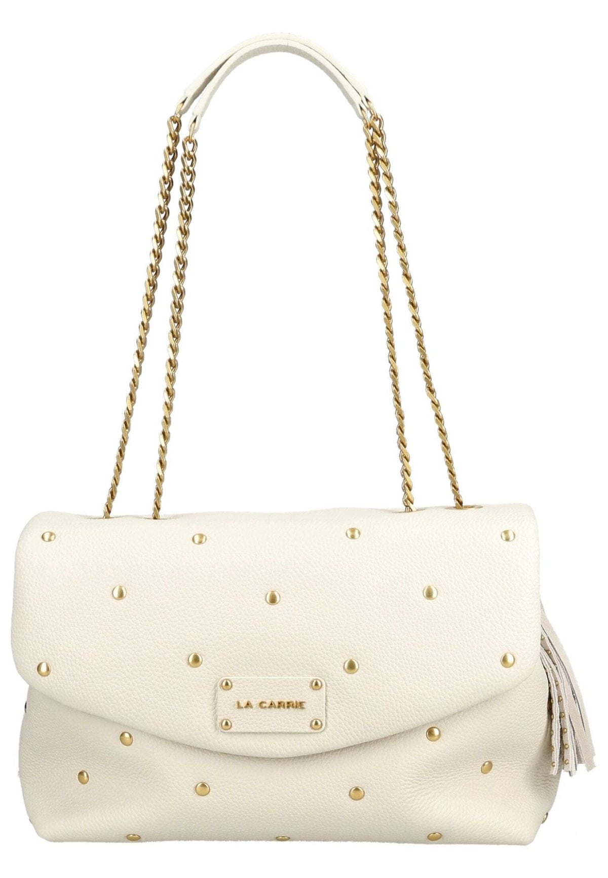 Diese stilvolle Schultertasche von La Carrie überzeugt mit einem eleganten Design und edlen Details. Das hochwertige Obermaterial wird durch dekorative goldfarbene Nieten verziert, die der Tasche eine moderne und zugleich raffinierte Ausstrahlung verleihen. Die harmonische Farbgebung unterstreicht den zeitlosen Look und macht das Modell zu einem vielseitigen Begleiter für zahlreiche Anlässe. Die langen Schulterriemen mit goldfarbener Kettenoptik sorgen für einen besonderen modischen Akzent und ermöglichen ein komfortables Tragen über der Schulter. Der Überschlag verleiht der Tasche eine klassische Silhouette und schützt gleichzeitig den Inhalt. Im Inneren bietet das Hauptfach ausreichend Platz für die wichtigsten Alltagsgegenstände und sorgt für eine übersichtliche Aufbewahrung. Ein dekorativer Anhänger mit Fransen rundet das Design stilvoll ab und setzt einen zusätzlichen modischen Akzent. Ob zu eleganten Outfits oder modernen Casual-Looks – diese Tasche ergänzt jedes Outfit auf stilvolle Weise.