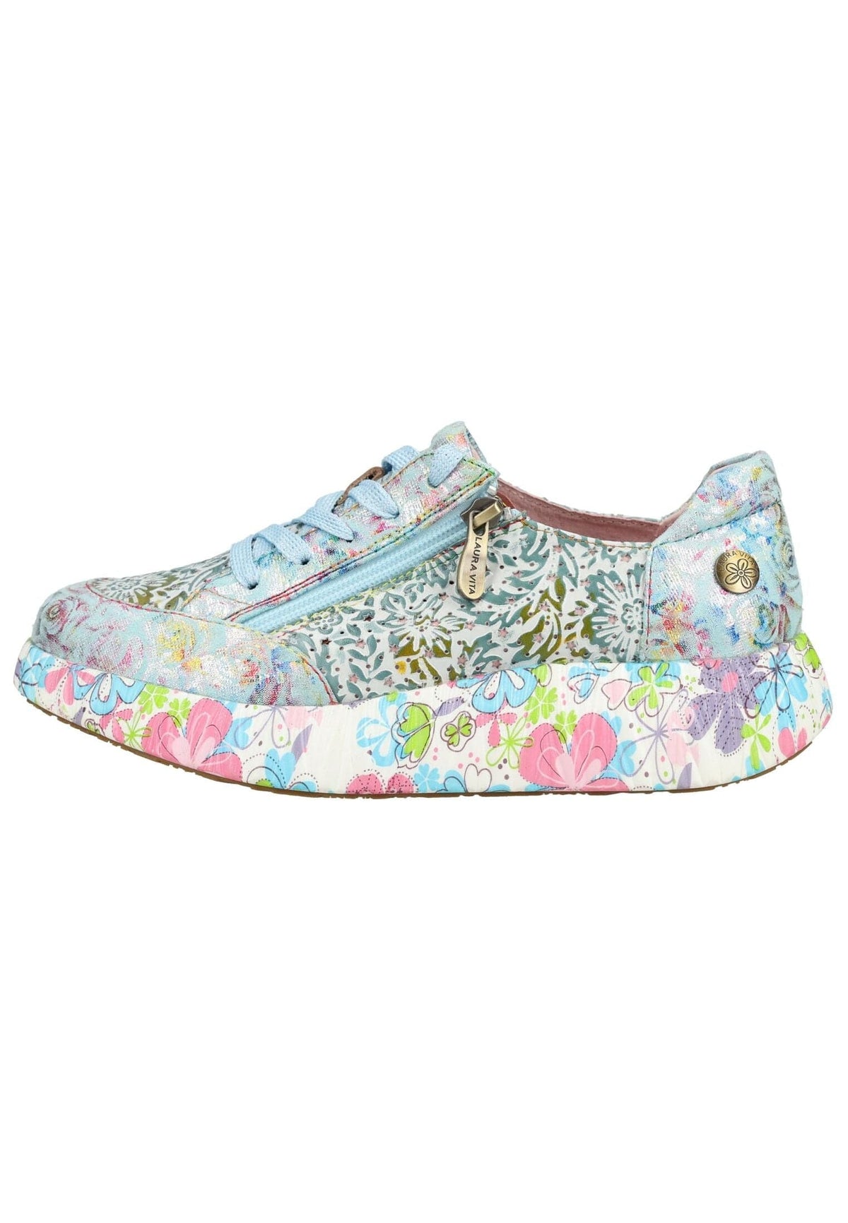 Dieser Sneaker von Laura Vita begeistert mit einem außergewöhnlichen, detailverliebten Design und setzt modische Akzente bei jedem Schritt. Das kunstvoll gestaltete Obermaterial mit floralen Mustern und harmonisch aufeinander abgestimmten Elementen verleiht dem Modell eine verspielte und feminine Ausstrahlung. Die seitliche Reißverschlusslösung ergänzt die klassische Schnürung und ermöglicht ein komfortables An- und Ausziehen, während sie gleichzeitig das besondere Design unterstreicht. Das integrierte Wechselfußbett bietet flexible Anpassungsmöglichkeiten und eignet sich ideal für individuelle Einlagen, wodurch ein hoher Tragekomfort gewährleistet wird. Die markant gestaltete Plateausohle mit dekorativen Details rundet den Look gekonnt ab und sorgt für einen angenehmen Auftritt mit modischer Präsenz. Ob als Highlight zu schlichten Outfits oder als Ergänzung zu kreativen Styles – mit diesem Sneaker von Laura Vita setzen Sie ein selbstbewusstes Statement mit unverwechselbarem Charme.