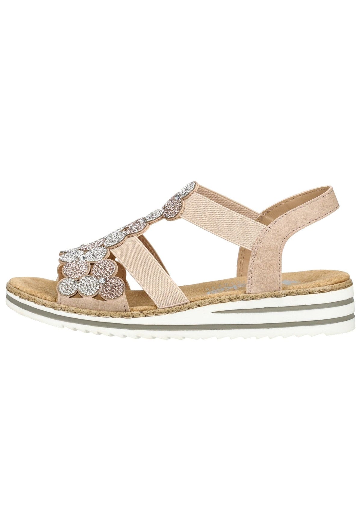 Diese bequeme Keilsandale von Rieker ist ein echter Blickfang mit ihren wunderschönen Steinchenverzierungen am Mittelsteg. Die Sandale lässt sich dank der elastischen Riemen schnell und einfach an- und ausziehen. Für besonderen Komfort sorgt die gepolsterte und feuchtigkeitsregulierende Textil-Decksohle sowie die keilförmige Laufsohle, die eine angenehme Gehhöhe bietet.